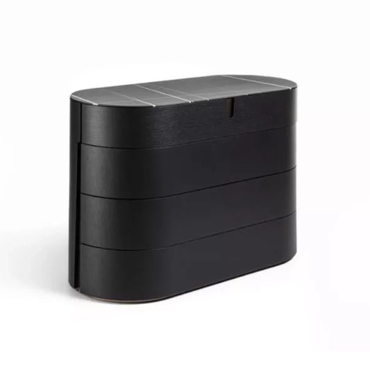 The monolithic Mary cabinet is another key product; the bar has two compartments with curved canaletta walnut doors and frosted glass details. The upper one is finished in brushed brass, while the lower one is in wood. Aria is a ceiling or wall-mounted modular bookcase with supporting ash columns. Its customizable composition can be designed with ash or smoked glass shelves, ash drawers and containers, supported by a matt black metal frame. Another Nineteen product is the Ziggy Baldacchino double bed, with a solid ash frame, wood slats and custom upholstery.